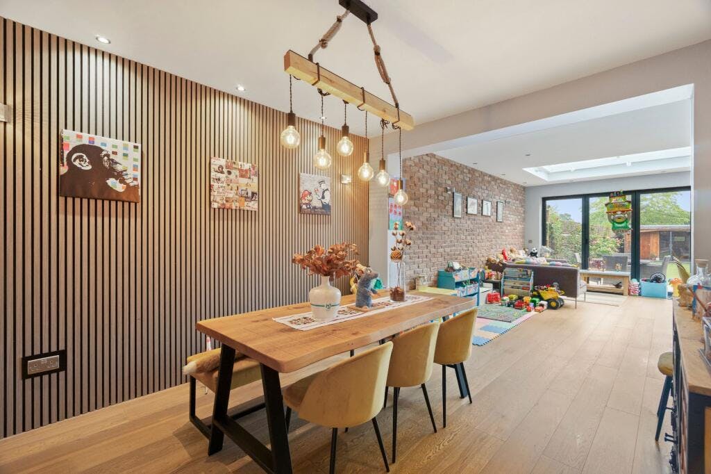 The ground floor features multiple reception areas, including a separate lounge and an open-plan sitting and dining space that flows seamlessly into the modern kitchen. With integrated appliances and a central island, it’s perfect for cooking, entertaining or family life. Large bay windows with bespoke wooden shutters flood the rooms with natural light, while exposed brick and wood panelling add warmth and character.
