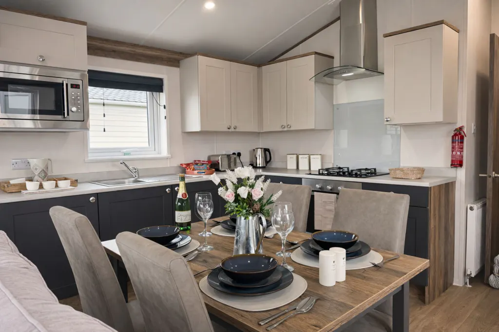 Positioned within a peaceful holiday park, this beautifully presented two-bedroom detached park home offers a superb blend of comfort and convenience, making it an ideal retreat for those seeking a tranquil escape. Purchasing here offers a generous 50-week non-residential season; the property is perfect for extended getaways or a home from home lifestyle. The heart of the home is its inviting open plan lounge, dining, and kitchen area, designed to create a sociable atmosphere for relaxing or entertaining guests. The contemporary kitchen is well-appointed with ample storage and workspace, seamlessly flowing into a spacious lounge and dining area, all finished to a high standard. The main bedroom benefits from its own private en suite shower room (in addition to a main shower room), ensuring comfort and privacy for residents and guests alike. The second bedroom is equally well proportioned and versatile, suitable for family, friends, or as a flexible work or hobby space. Residents can enjoy exclusive use of the park’s excellent facilities, including a heated swimming pool, perfect for unwinding or maintaining an active lifestyle. The recently refurbished clubhouse is a real highlight, offering a welcoming atmosphere and a range of amenities, with the added bonus of a residence discount for food and beverages. This park home is thoughtfully designed to maximise light and space, with modern fixtures and neutral décor throughout, allowing new owners to add their own personal touches. Double glazing and efficient heating ensure year round comfort, while practical touches such as built in storage and a well planned layout add to the property’s appeal. The holiday park itself is renowned for its friendly community and well maintained grounds, providing peace of mind and a sense of belonging. With its combination of stylish interiors, excellent facilities, and a sought after location within a quiet park setting, this property represents a rare opportunity to secure a high quality holiday home with the flexibility of a long season. Whether you are looking for a weekend escape, an extended break, or a base to explore the surrounding area, this two bedroom detached park home offers an outstanding lifestyle opportunity in a truly special environment. Early viewing is highly recommended to fully appreciate all that this delightful property and its setting have to offer.