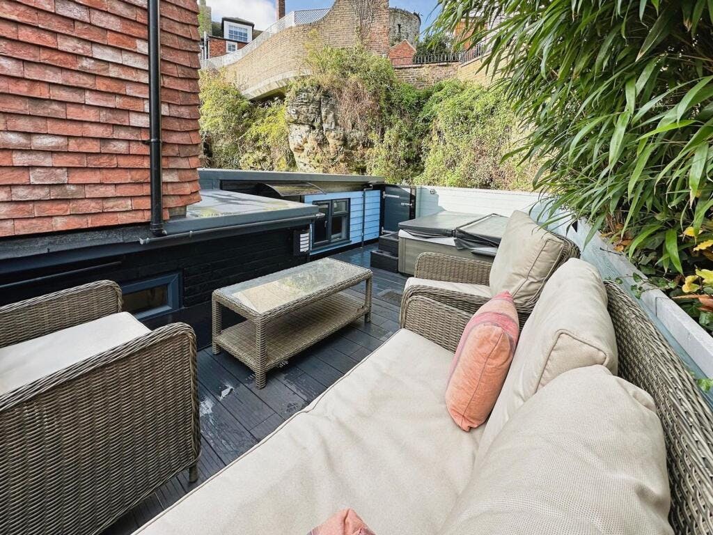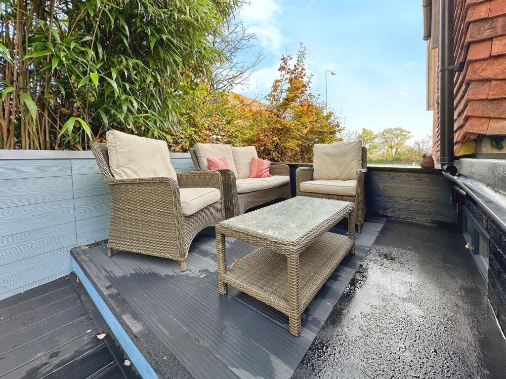 Externally to the rear, there are two low maintenance seating areas, one currently with a hot tub in place. Infront of this is a further seating area and beyond this is the off road parking for multiple vehicles.