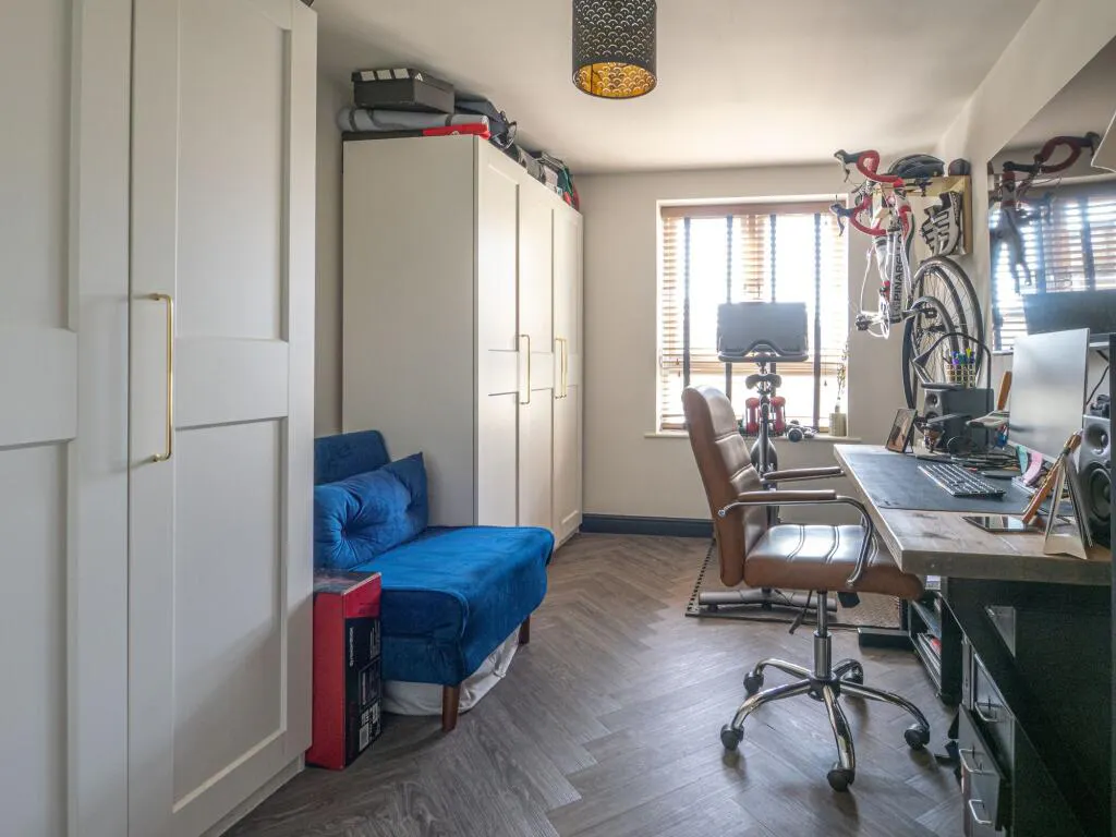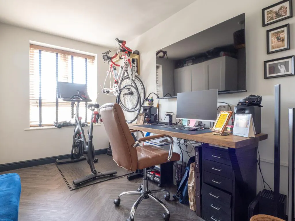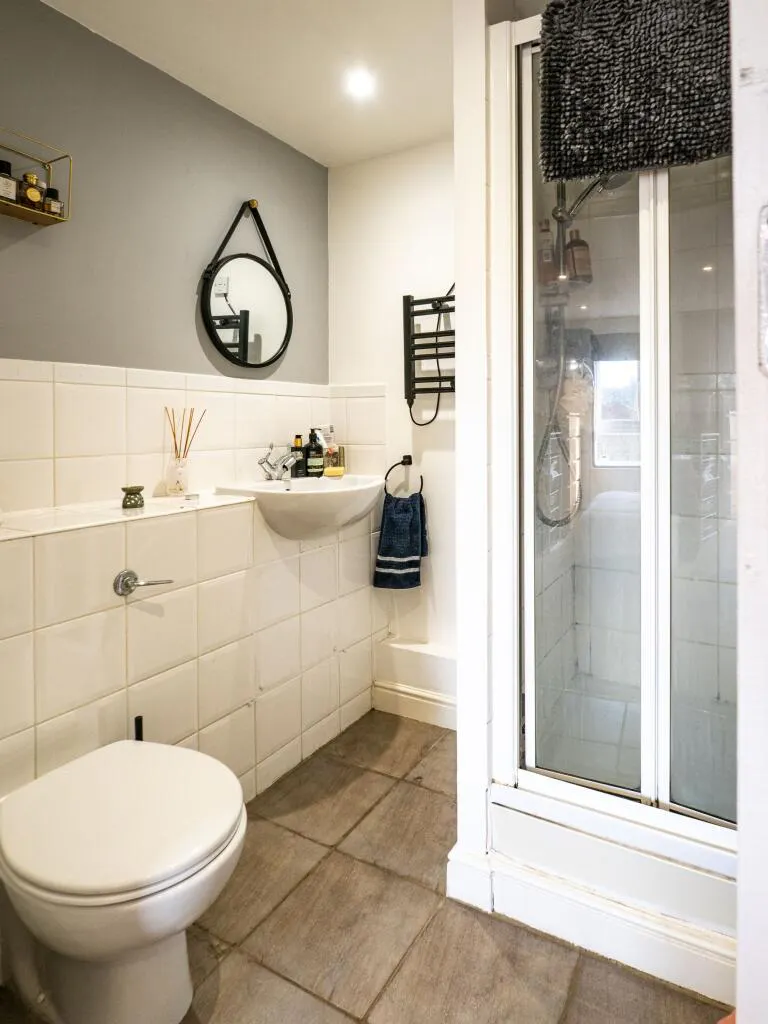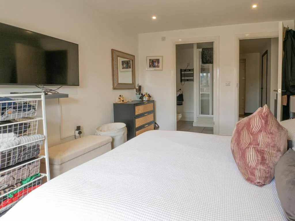 The primary bedroom is a generous retreat with a fully tiled, private ensuite shower room. A second double bedroom offers the essential flexibility needed for a home office or guest room. Both the ensuite and the main bathroom—which features a shower over the bath and integrated storage—are finished to a crisp, contemporary standard.