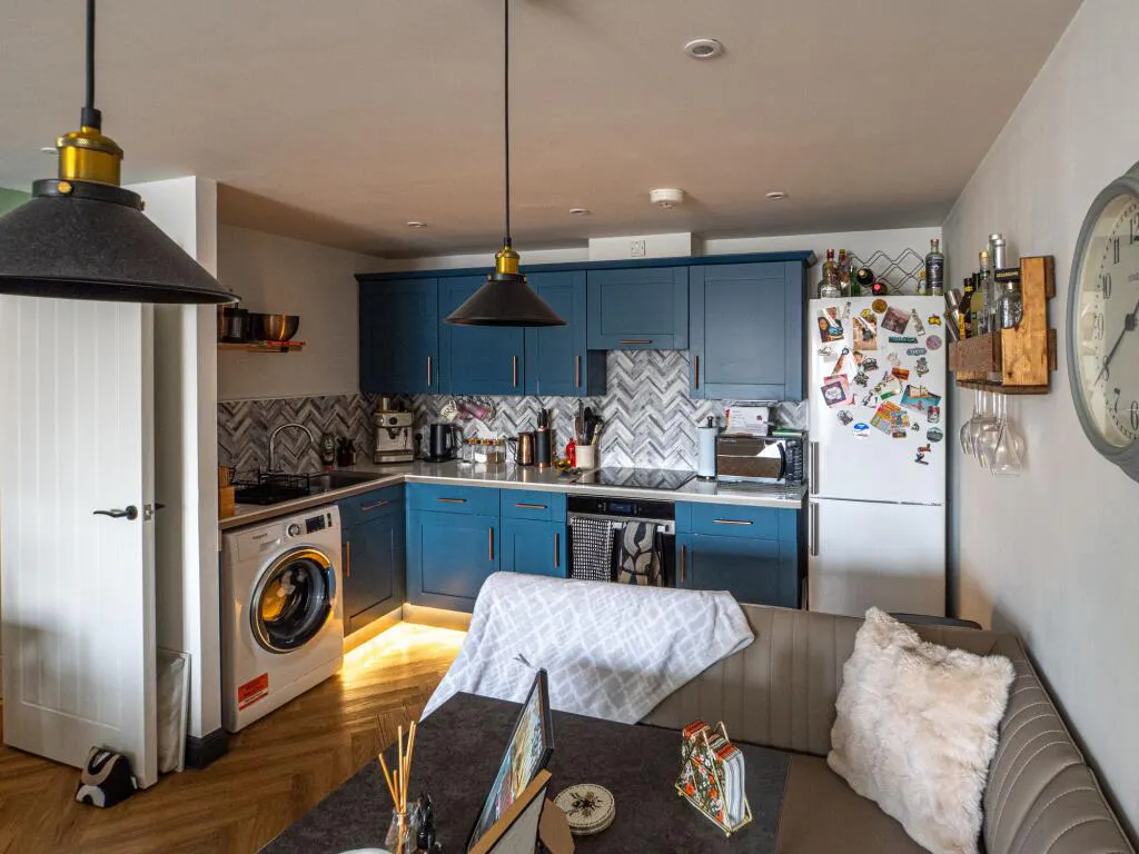 The heart of the home is an expansive open-plan lounge featuring rich wooden flooring and contemporary wood panelling. A Juliet balcony directly overlooks the residents' roof garden, ensuring the living space remains bright and connected to the outdoors. The integrated kitchen is sleek and functional, fitted with an induction hob, fridge freezer, and washing machine.